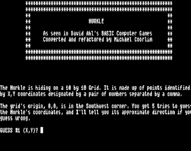 Version of Hurkle, created by Bob Albrecht of the People's Computer Company and adapted and refactored from a type-in listing in David Ahl's 1973 book "BASIC Computer Games".